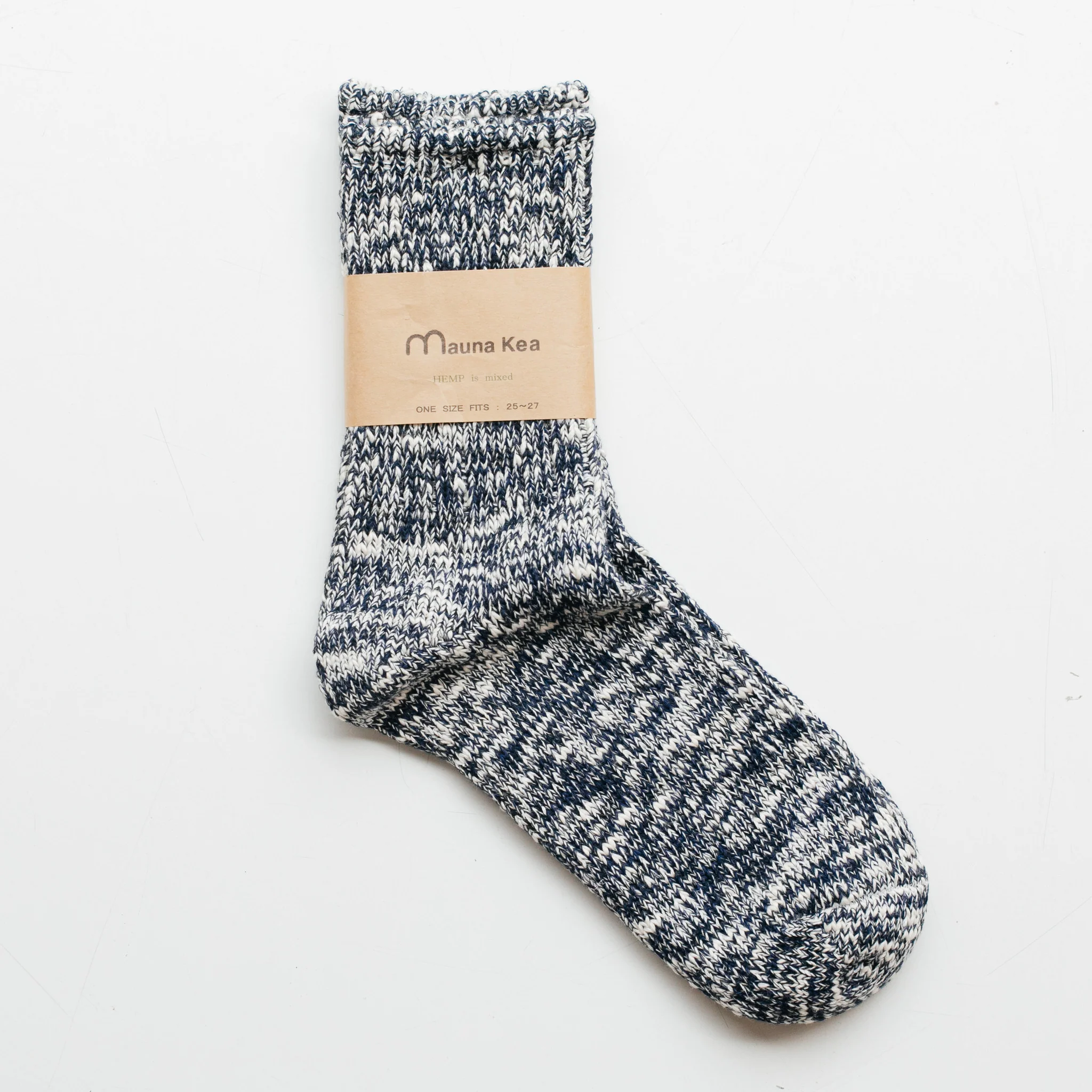 Mauna Kea produce socks on vintage machines using a hemp / cotton blend to ensure high moisture absorption and in a tubular shape with a thick yarn and loose knit to make them supremely comfortable.