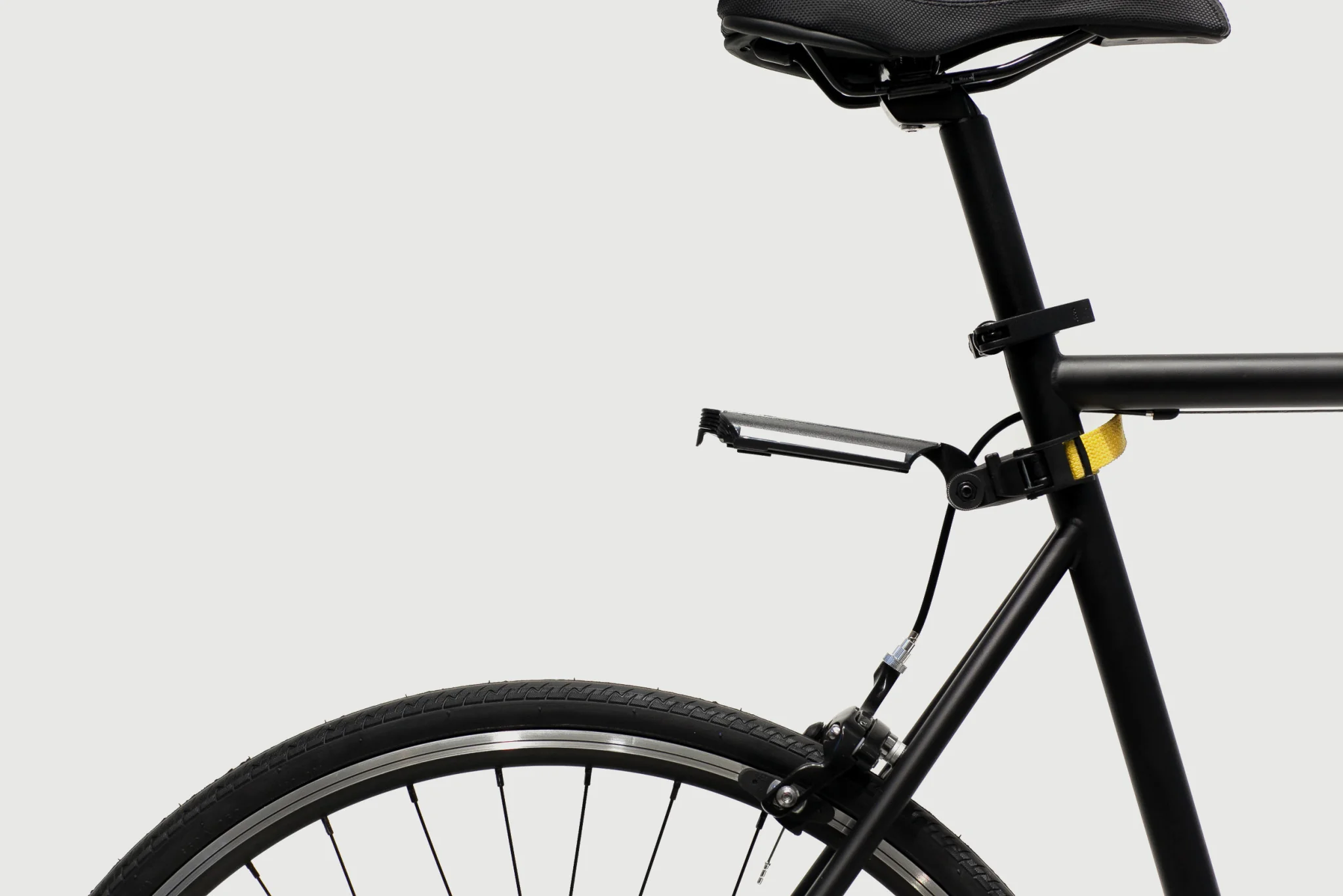 Portable mudguard that can be clipped on when needed and quickly stowed away when you don't. It will fit to the seat post or seat tube of most bikes.
